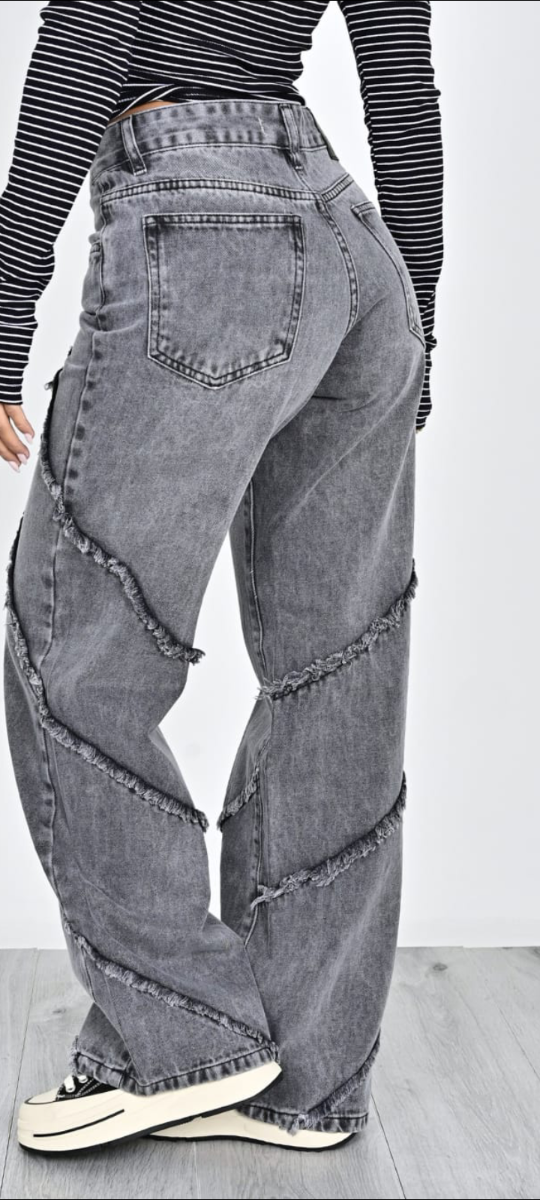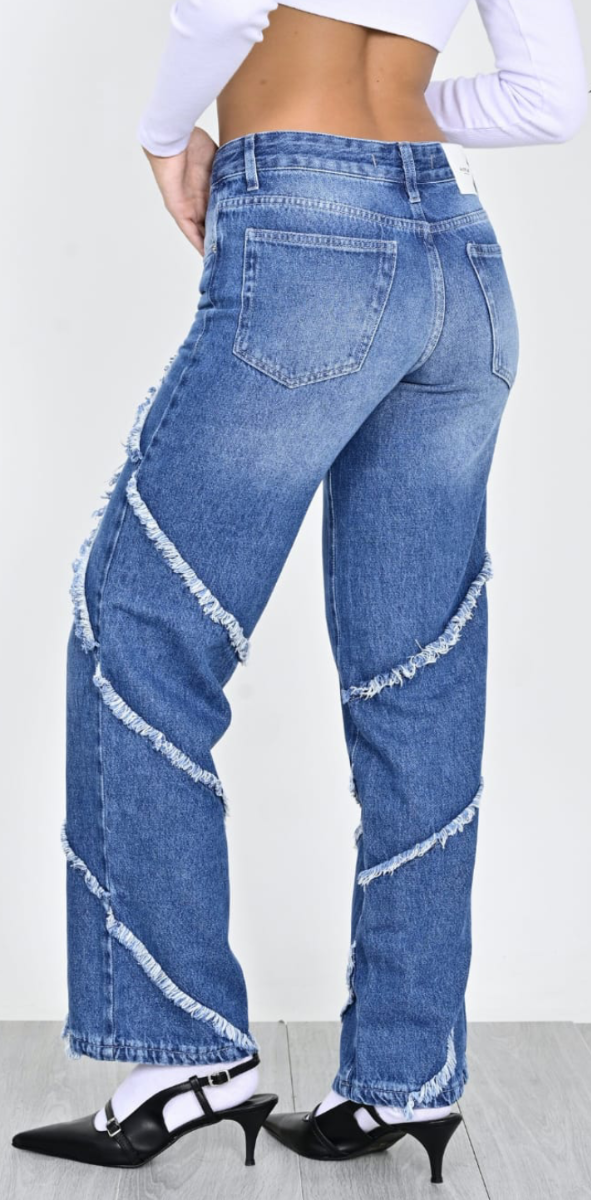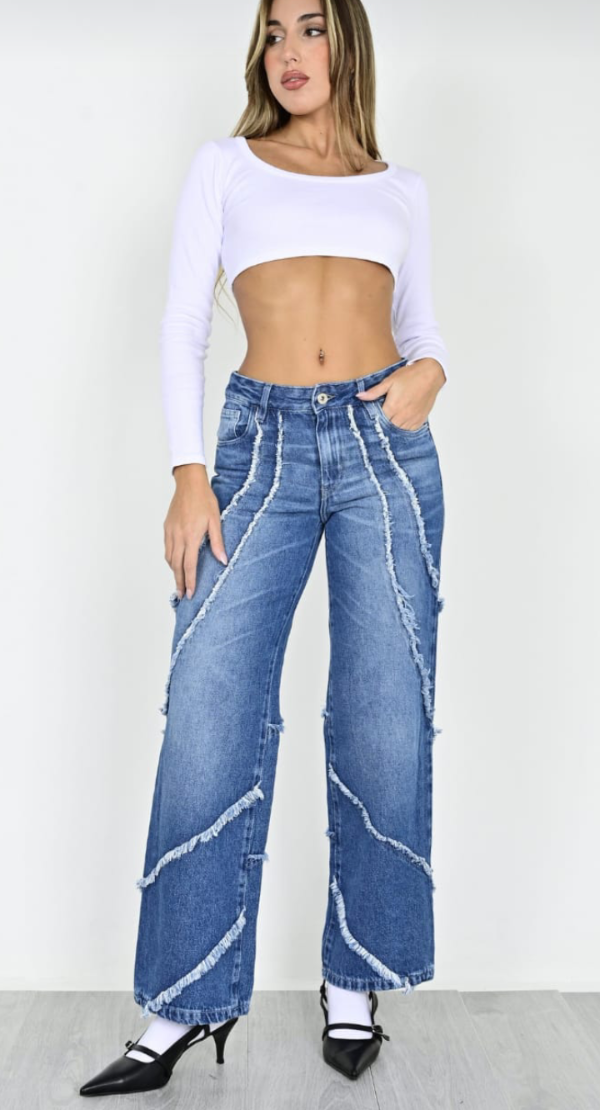 Wide leg tiro medio, tela rígida con aplicación de flecos en azul claro y negro gastado