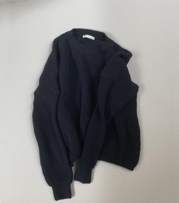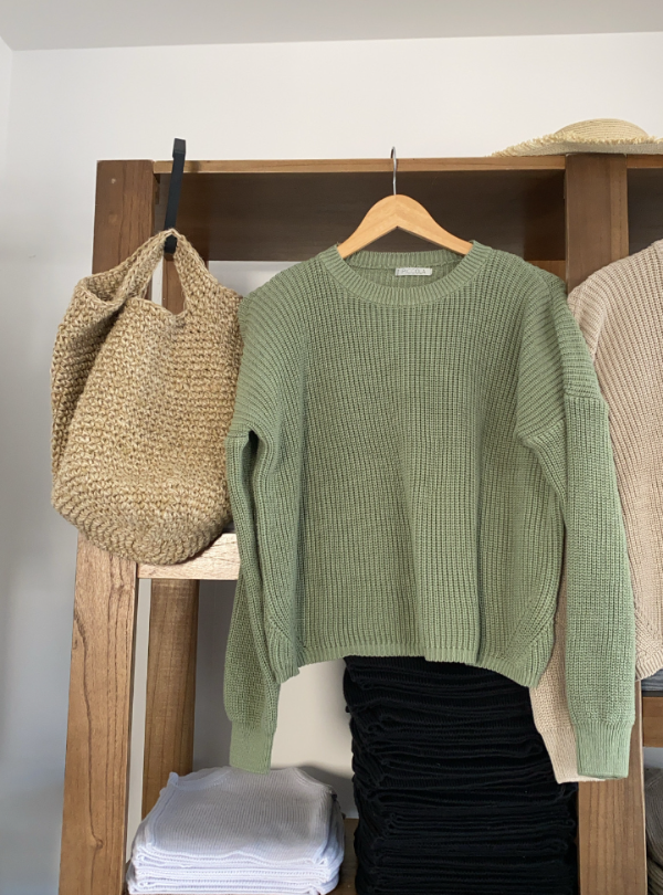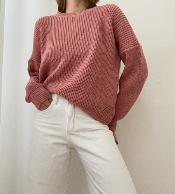 Sweater con cuello redondo y detalle en la parte izquierda inferior.
